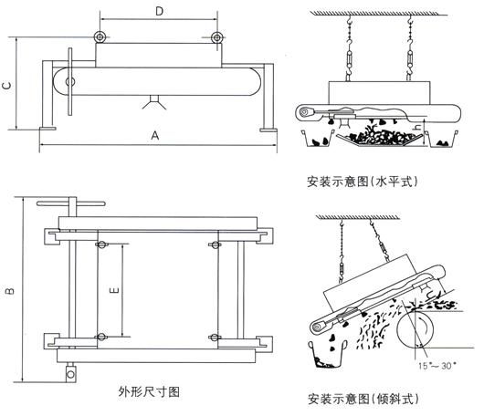 | 型號\參數(shù)\項目 | 適應帶寬 mm | 額定吊高 h=mm | 物料厚度 ≤mm | 磁場強度 ≥mT | 適應帶速 ≤m/s | 重量 kg | 外形尺寸 A×B×C | 懸掛尺寸 D×E |